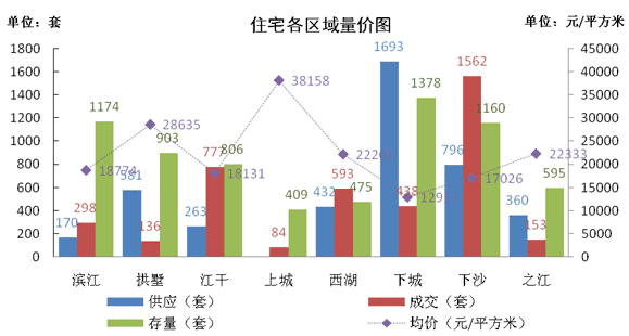 存量: 由于连续两个月的大量消化,下沙的存量下降很快,由2月底的2317套下降到了1160套,减少了一半以上。目前存量最低的是上城区和西湖区,都只有400多套房源。