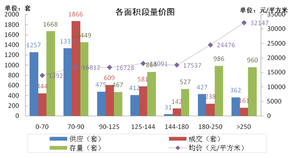 供应: 4月份市场新增供应中180方以上面积新增供应789套,占当月新增供应套数的18%,比3月份的比例下降了一半。市场产品结构正在逐步回调,从存量上看180方以上产品的存量比例过于偏高,近期会逐步下降。
