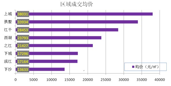 由于下沙区域降价潮蔓延,8月成交均价仍然以下沙为最低,其成交均价仅为均价最高的上城区的1/3。