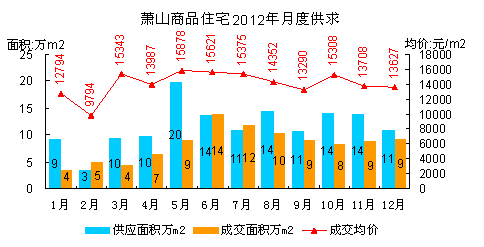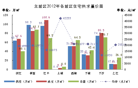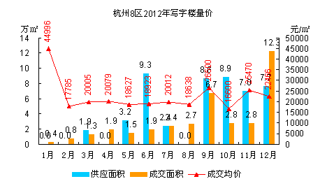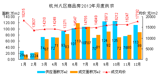 2012年杭州8区商品房市场供求略现供大于求,6-8月市场处于供不应求,但自9月起重回供大于求格局,存量在下半年再度上扬,致使年末存量突破历史最高存量水平,高达1069万㎡,比年初存量增长近百万平米。