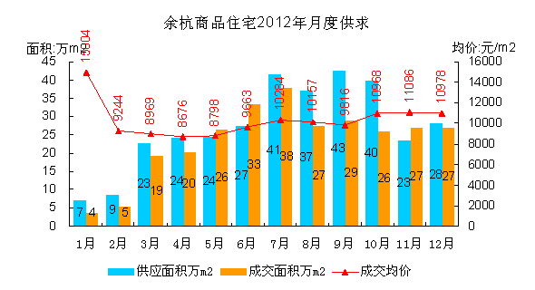 根据余杭商品住宅市场2012年月度走势看,除了5月、6月、11月三个月供应小于成交外,所有月份均明显供应大于成交,全年处于供大于求状态。成交量各月变化走势与主城区如出一辙,6-7月达到巅峰,下半年出现衰退迹象。全年新增供应高峰出现在7-10月,连续4个月保持在40万方左右的月新增供应量,而当年单月成交面积从未突破40万㎡。
