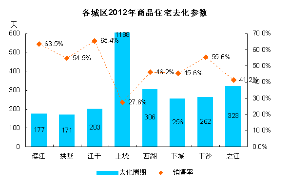 根据各城区2012年的销售率表现,滨江和江干区情况最好,去化率超过60%,而上城区由于存量以高端豪宅为主,被限购严重抑制,成交量极低,虽然杭州市场全年表现回暖,但上城区却没有起色,仍在重灾区,其销售率在各城区中最低,不到30%,与去年比几乎无变化。从平均去化周期看,滨江区和拱墅区最短,在170多天,今年主要以新盘销售为主,而西湖区和之江老盘存量积压较多,今年老盘销售较多,平均去化期在300天以上。