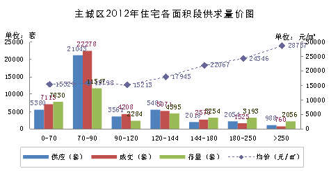 在双限政策下,2012年主城区商品住宅市场90㎡以下的产品供求比例都进一步上升,刚需在市场中的主导作用越来越大。尤其以70-90㎡的户型最多,全年新增供应约2.1万套,成交约2.2万套存量也达到了1.3万套。由于酒店式公寓以70方以下小户型为主,而今年酒店式公寓市场远不如去年火爆,原因在于住宅的大幅降价削弱了其价格优势,表现在供求面积结构上,70方以下产品2012年出现较大的下降。