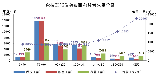 余杭2012年三类产品量价情况如下表。余杭市场别墅产品的总量明显高于主城区,但销售率同样很低。今年余杭普通公寓供求相对较平衡,套数供求比为1.06,而面积供求比为1.1,表明今年新增普通公寓户型面积较上年有所上升。