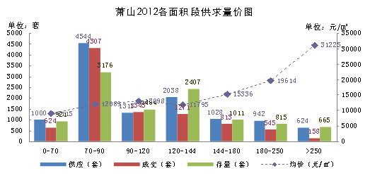 萧山商品住宅市场2012年70-90㎡户型新增供应量最多,新增供应4544套,略高于去年,成交量也大幅增长,成交4307套,接近于去年的两倍,存量与去年底相比仅有小量上升。