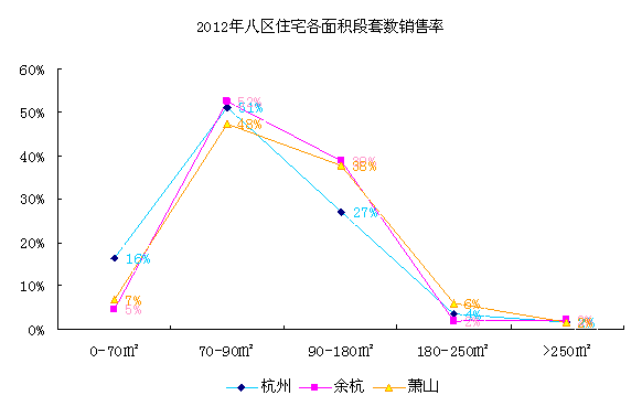综合三大区域各面积段的套数销售率,70-90㎡的销售率都是最高的,其中余杭与杭州超过50%,可算是冬天里的春天。其它面积段销售率就不太乐观,尤其在极大和极小两个户型端,余杭和萧山销售率都不足10%。
