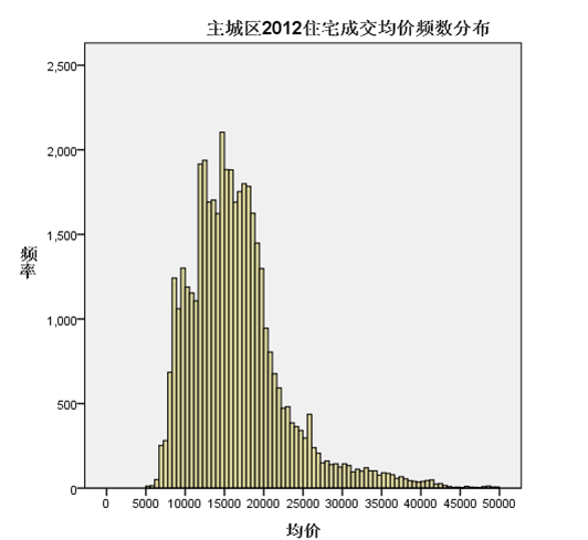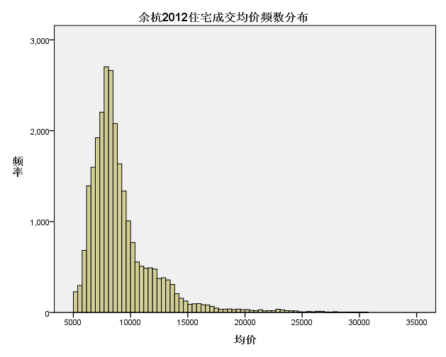 对余杭2012年成交商品住宅剔除单价3.5万以上的63套后进行单价频数统计,根据频数分布看,分布中心区大致位于7000-9000之间,且左右都呈连续分布。单价10500和15000元是右侧分布下降变速分界点,分布的尾区从单价25000元开始。
