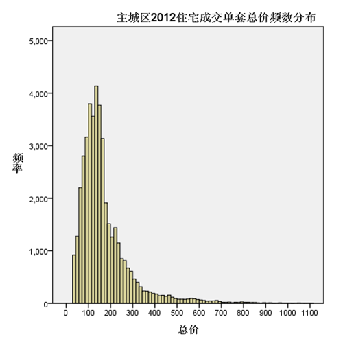 对2012年主城区成交的商品住宅剔除201套总价1100万元以上部分后进行频数统计得到总价分布图。可以看出,刚需的集中分布区在80-160万之间,超过160万以后显著下降。200-350万之间形成第二个下降带,这是改需分布的主要区间。在总价700万元开始,分布频数显著稀少,因此高端住宅的总价区分线是在700万元左右。