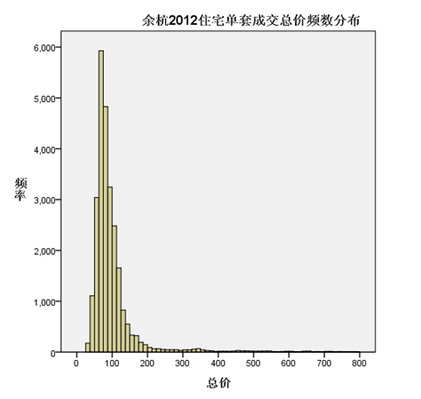 对余杭2012年成交商品住宅剔除单套总价800万以上131套后进行频数统计得到单套总价分布图,单套总价分布中心位于70-90万之间,与去年相比无变化。总价150-200万元是分布快速下降到缓慢下降的缓冲带,总价200-400万为平稳分布带,到400万以上进入分布尾区。