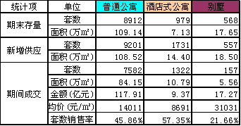 本报告将商品住宅划分为普通公寓、酒店式公寓和别墅三个大类,酒店式公寓仅包含产权年限非70年的住宅产品,产权年限为70年的一律不划分为酒店式公寓,别墅包括叠排、联排和独幢别墅三种形态产品。