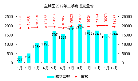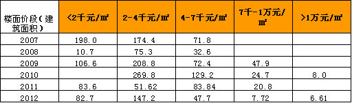 通过对主城区2012年成交商品住宅剔除单价5万/㎡以上189套后的单价频数分布统计,数量最高一组今年仍然在单价14000-15000元/㎡间出现,单价6000元/㎡以下成交量微乎其微。在单价11000-12000元/㎡之间出现显著断层面,未沿左侧价格递增趋势连续分布,而是内凹分布。分布的中心区位于14000-18000元/㎡之间,属于市场价格的主流区间,需求方对这一价格区间的接受度最高。