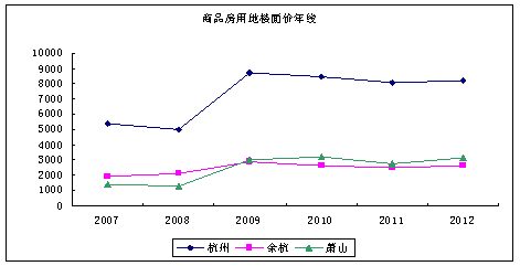 从各年平均楼面价看,杭州地价基本保持高于余杭和萧山4000-6000元/㎡的水平。萧山地价自2009年后,由低于余杭转变为高于余杭,地价上涨比余杭快。杭州和余杭地价水平在2009年达到峰值后呈现回落趋势,但降幅较小,今年甚至出现小幅回升。萧山地价水平从2009年起维稳在2500元/㎡左右波动。
