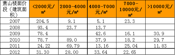 萧山2012年成交住宅用地楼面价各段都差不多,但楼面价1万以上宅地今年无成交。楼面价2000以下和4000-7000之间今年供地较去年增长。而楼面价2000-4000的土地大幅减少,今年仅成交28万㎡。